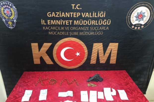 Gaziantep Emniyet Müdürlüğüne bağlı KOM Şube Müdürlüğü ekipleri, il merkezinde bulunan 3 akaryakıt istasyonundan sahte para ile akaryakıt alındığı yönündeki ihbarın üzerine harekete geçti. Ekipler, birçok ilde piyasaya sürülen aynı seri numaralı sahte paralarla, çalıntı kaydı bulunan iki araca yakıt alındığını tespit etti. Şüphelilere yönelik operasyon gerçekleştiren ekipler, şüphelilerin ikametlerinde ve olayda kullanıldıkları araçlarda yaptıkları aramalar sonucu; 1 adet tabanca, 61 adet fişek, 6 adet sahte para ele geçirdi. Ekipler olayla ilgili olarak 2 şüpheliyi yakalayarak gözaltına alırken şüphelilerin yasal işlemlerinin devam ettiği öğrenildi.