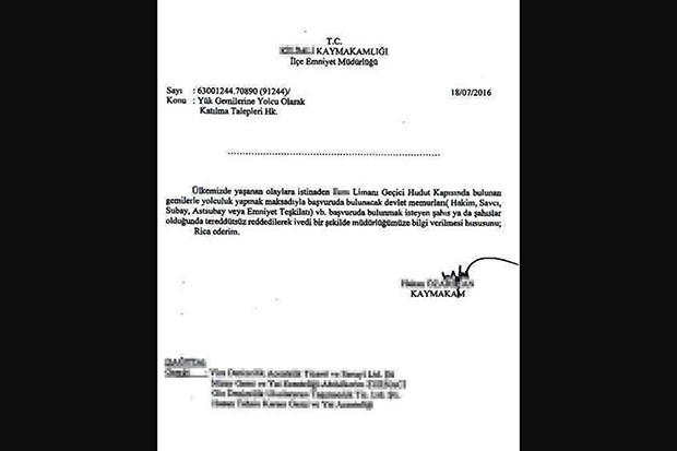 "Ülkemizde yaşanan olaylara istinaden, …. Limanı geçici hudut kapısında bulunan gemilerle yolculuk yapmak maksadıyla başvurularda bulunan devlet memurları, (hakim, savcı, subay, astsubay veya emniyet teşkilatı vb) başvuruda bulunmak isteyen şahıs yada şahıslar olduğunda tereddütsüz reddedilerek, ivedi biri şekilde müdürlüğümüze bilgi verilmesi hususunu rica ederim" denildi. Aynı yazının yolcu taşımacılığı yapılan seyahat firmaları ve denizcilik şirketlerine de gönderildiği kaydedildi.
