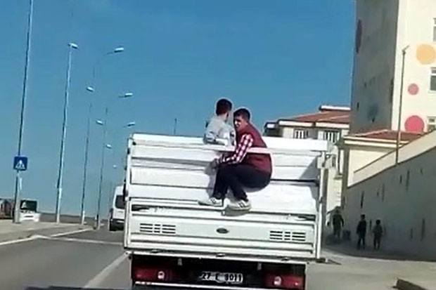 Gaziantep’te bir kamyonetin kasasında 2 genç, hiçbir güvenlik tedbiri almadan yolculuk etti. Gençlerin yolculuğu görenlerin yüreklerini ağızlara getirdi.
