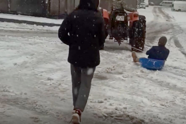 Gaziantep’e 54 yıl aradan sonra yağan yoğun kar vatandaşlara büyük sevinç yaşattı. Kent merkezi beyaz örtüyle kaplanırken, vatandaşlar sokaklarda biriken karın tadını çıkardı. Kimi kar topu savaşı yaparken, bir vatandaş ise ilginç bir şekilde kar üstünde eğlendi. Merkez Şehitkamil ilçesine bağlı Beylerbeyi Mahallesi'nde yaşayan bir vatandaş, traktörün arkasına bağladığı leğenle snowboard yaptı. Görenleri hayrete düşüren o anlar başka bir vatandaşın telefon kamerasına yansıdı.