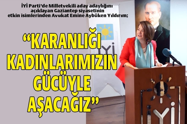 İYİ Parti Gaziantep Milletvekili aday adayı Avukat Emine Aybüken Yıldırım, partisinin il başkanlığında kalabalık ve coşkulu kalabalığa hitap etti. “Kadına ve kadın gücüne önem veren Genel Başkanımız Sayın Meral Akşener, "Kadınlarımızın gözlerindeki gülüşe bile tahammül edemeyen karanlığı, kadınlarımızın azmi, kadınlarımızın kararlılığı ve kadınlarımızın gücüyle aşacağız. Çocuklarının üzerine titreyen anne şefkatiyle, memleketimizi el birliğiyle aydınlığa çıkaracağız” dedi.