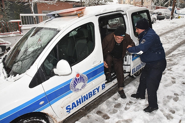 Gaziantep’in Şahinbey ilçesinde karlı havada yürümekte güçlük çeken yaşlılara yardım elini zabıta ekipleri uzattı.