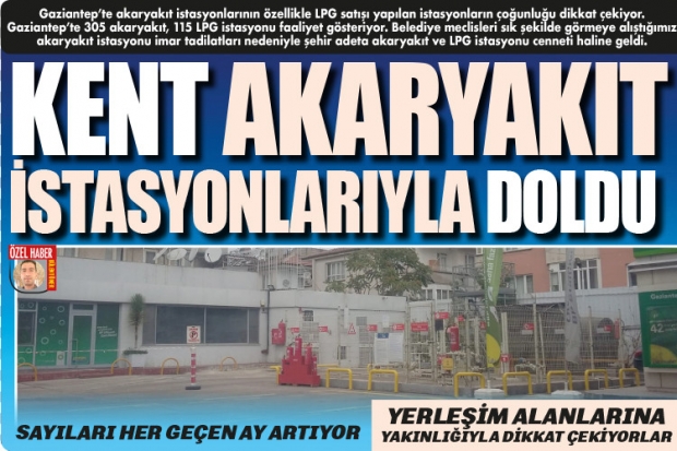 Gaziantep’te akaryakıt istasyonlarının özellikle LPG satışı yapılan istasyonların çoğunluğu dikkat çekiyor. Gaziantep’te 305 akaryakıt, 115 LPG istasyonu faaliyet gösteriyor. Belediye meclisleri sık şekilde görmeye alıştığımız akaryakıt istasyonu imar tadilatları nedeniyle şehir adeta akaryakıt ve LPG istasyonu cenneti haline geldi.