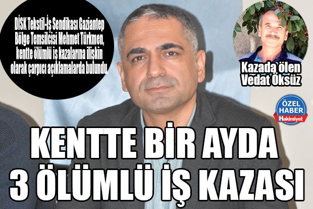 DİSK Tekstil-İş Sendikası Gaziantep Bölge Temsilcisi Mehmet Türkmen, kentte 2018 yılında yaşanan ölümlü iş kazalarında 50 insanın yaşamını yitirdiğine dikkat çekti. Türkmen 2019 yılının Kasım ayında ise bu sayının 3 olduğunu anlattı. Ülke genelinde ve kentte yaşanan ölümlü iş kazalarında yaşamını yitirenlerin ancak yüzde 2’sinin sendikalı olduğuna dikkat çeken Türkmen açıklamasını şu şekilde sürdürdü;