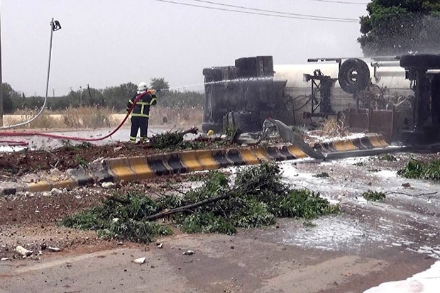 Kilis'te LPG yüklü tanker devrildi. İtfaiye ekipleri tarafından soğutma çalışması başlatılan tankere yaklaşık 5 kilometre mesafede güvenlik çemberi oluşturuldu.