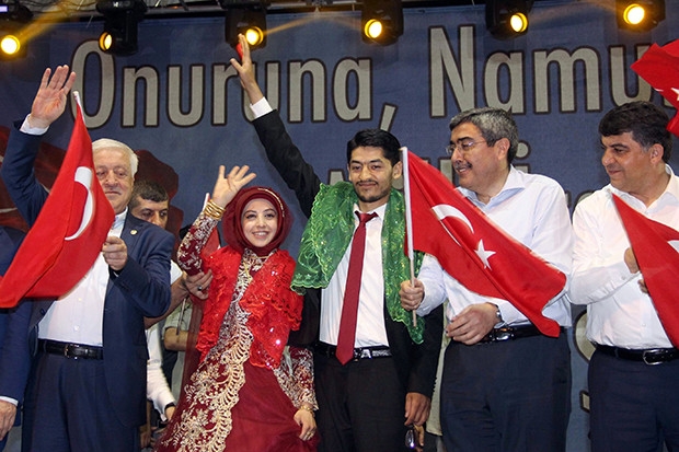 Gaziantep'te Cumartesi akşam nikahı kıyılacak olan Mücahit Sarıoğlu ve Rukiye Bileci çifti, kına gecesi giydikleri yöresel kıyafetlerle, Demokrasi Meydanı'na koşarak, nöbete destek verdi. Ellerinde Türk Bayrakları ile alana giden çift, platforma çıkarak, marş ve kahramanlık türkülerine eşlik etti. 15 Temmuz akşamından itibaren demokrasi nöbetine katıldığını belirten damat adayı Mücahit Sarıoğlu, "Bugün kınamız vardı, inşallah cumartesi günü de nikahımız olacak. Buradan da şehir büyüklerimizi davet ediyoruz. O gün de inşallah burada olacağız. Biz darbeyi, amasız, fakatsız lanetliyoruz. Kim olursa olsun her kim yapmışsa, kabul etmiyoruz. Bir daha da memleketimizin ülkemizin başına gelmemesini Rabbimden niyazda bulunuyoruz" dedi.