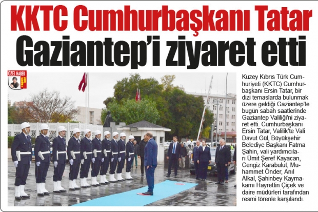 Kuzey Kıbrıs Türk Cumhuriyeti (KKTC) Cumhurbaşkanı Ersin Tatar, bir dizi temaslarda bulunmak üzere geldiği Gaziantep’te bugün sabah saatlerinde Gaziantep Valiliği’ni ziyaret etti. Cumhurbaşkanı Ersin Tatar, Valilik’te Vali Davut Gül, Büyükşehir Belediye Başkanı Fatma Şahin, vali yardımcıları Ümit Şeref Kayacan, Cengiz Karabulut, Muhammet Önder, Anıl Alkal, Şahinbey Kaymakamı Hayrettin Çiçek ve daire müdürleri tarafından resmi törenle karşılandı.
