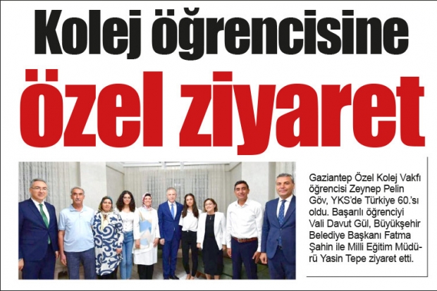 "Okulumuz Öğrencisi Zeynep Pelin Göv'ün 2022 YKS Türkiye 60. sı olarak elde ettiği büyük başarısından dolayı Sayın Valimiz Davut Gül, Sayın Büyükşehir Belediye Başkanımız Fatma Şahin, Sayın İl Milli Eğitim Müdürümüz Yasin Tepe ve beraberindeki protokol öğrencimizi ve ailesini ziyaret etmişlerdir. Sayın Valimize, Sayın Büyükşehir Belediye Başkanımıza, Sayın İl Milli Eğitim Müdürümüze ve beraberindeki heyete ziyaretlerinden dolayı okulumuz yönetimi ve öğretmenleri adına teşekkür eder, öğrencimizin başarılarının devamını dileriz."