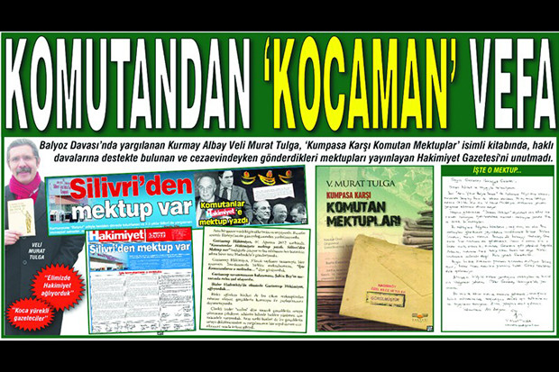 Balyoz Davası’nda yargılanan Kurmay Albay Veli Murat Tulga, ‘Kumpasa Karşı Komutan Mektuplar’ isimli kitabında, haklı davalarına destekte bulunan ve cezaevindeyken gönderdikleri mektupları yayınlayan Hakimiyet Gazetesi’ni unutmadı.