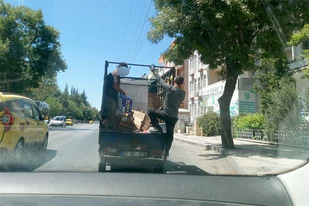 Gaziantep’te Ordu Caddesi’nde seyir halinde bir küçük kamyonetin arkasında yer alan kişiler hem trafiği hem de kendi can güvenliklerini hiçe saydı. Tehlikeli şekilde seyir eden küçük kamyonette bulunan kişilerin geri dönüşüm toplayan vatandaşlar olduğu anlaşıldı.