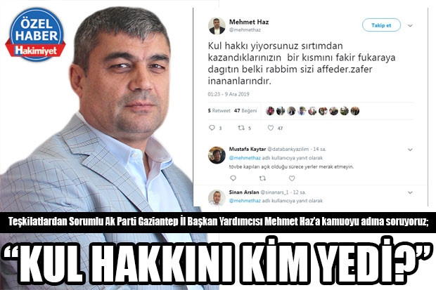 Sosyal medya hesabından, “Kul hakkı yiyorsunuz sırtımdan kazandıklarınızın bir kısmını fakir fukaraya dağıtın belki rabbim sizi affeder. Zafer inananlarındır.” Şeklinde takipçilerine seslenen Teşkilatlardan Sorumlu Ak Parti Gaziantep İl Başkan Yardımcısı Mehmet Haz, Şahinbey Belediyesi Başkan Yardımcılığı görevindeyken yapılan yolsuzlukla ilgili yerel mahkemede gün aldığı dosyanın neden Yargıtay’da yıllardır bekletildiği, yerel seçim sürecinde istifası evrak kayıttan geçirildiği halde geri alınması, son olarak daha 10 gün önce yine whatsapp grubunda yazdığı bel altı ifadeleri tartışma konusu olmuştu.