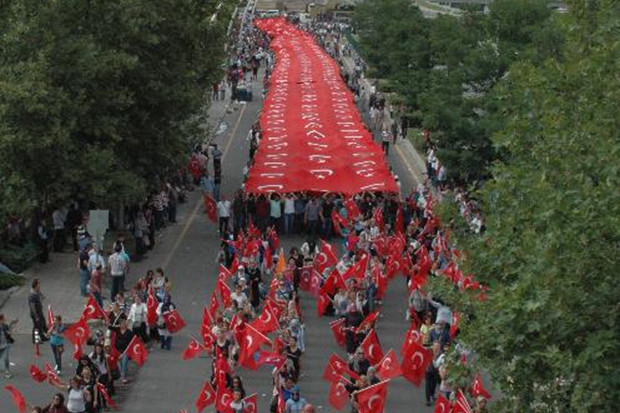 AK Parti, kuruluşunun 15. yılını partisinin genel merkezinde düzenlediği etkinlikle kutluyor. 15 Temmuz darbe kalkışmasında şehit olan vatandaşlar anısına bu yıl sade bir etkinlik düzenlendi. Binlerce AK Partili, etkinlik çerçevesinde, Külliye’den AK Parti Genel Merkezinin olduğu alana doğru “vatan sana canım feda” sloganlarıyla bin 500 metrelik dev Türk bayrağını açarak yürüdü. Dev Türk bayrağına, tarihte kurulmuş 16 Türk devletinin bayraklarını tutan vatandaşlar öncülük etti. Polis yürüyüşün olduğu sokakta yoğun güvenlik önlemleri aldı. Ana caddeler ve sokaklardan bazıları trafiğe kapatıldı. Polis helikopteri de trafiğe kapatılan yollar ile etkinlik ve yürüyüşün düzenleneceği yer ve güzergah üzerinde sürekli denetim yaparak, birimleri olası olumsuzluklara karşı yönlendirdi. Öte yandan polisekipleri tarafından dronla yürüyüş alanın izlenmesi dikkat çekti.