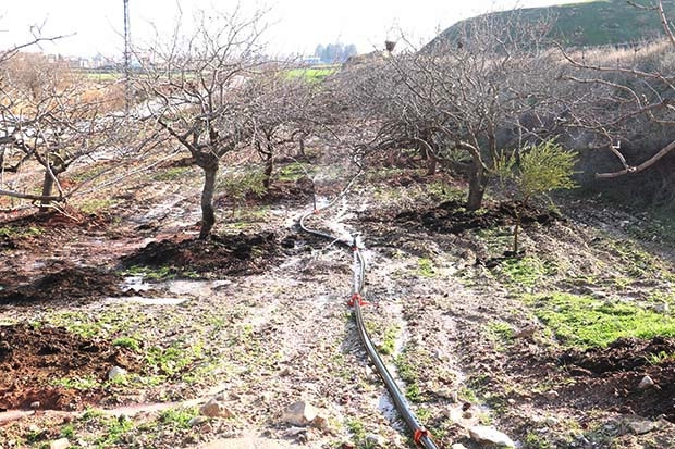 Gaziantep’te fıstık yetiştiren çiftçiler, yaşanan kuraklık nedeniyle sulama sistemi ile ağaçları sulayarak önlem alıyor.