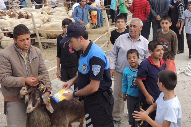 Gaziantep İl Emniyet Müdürlüğüne bağlı Toplum Destekli Polis ekipleri, Kurban Bayramı öncesinde hayvan pazarında broşür dağıtarak, vatandaşları sahte para konusunda bilinçlendirdi.
