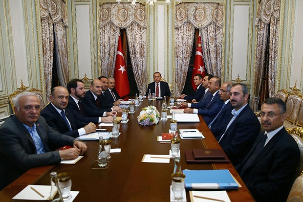 CUMHURBAŞKANI Recep Tayyip Erdoğan, Başbakan Binali Yıldırım ile bazı bakanlar ile Mabeyn Köşkü'nde 4 saat görüştü. Cumhurbaşkanı Recep Tayyip Erdoğan, Akşamüzeri Kısıklı'daki evinden Mabeyn Köşkü'ne geçti. Burada özel görüşmeler yapan Erdoğan saat 20.30'da Başbakan Binali Yıldırım ile bazı bakanları kabul etti. Basına kapalı olarak gerçekleştirilen görüşme ile ilgili açıklama yapılmadı. Saat 00.30'da sona eren görüşmenin ardından önce bakanların bulunduğu konvoy çıkış yaptı. Daha sonra Erdoğan ile Yıldırım'ın konvoyu Mabeyn Köşkü'nden ayrıldı.