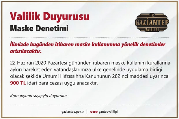 Türkiye’nin birçok kentinde uygulanan maske takma zorunluluğu Gaziantep’te uzun süredir yürürlükteydi. Gaziantep valiliği yasağı; " 22 Haziran 2020 pazartesi gününden itibaren maske kullanım kurallarına aykırı hareket eden vatandaşlarımıza ülke genelinde uygulama birliği olacak şekilde umumi hıfzıssıhha kanununun 282. maddesi uyarınca 900 TL idari para cezası uygulanacaktır" şeklinde duyurdu. Buna göre Pazartesi gününden itibaren kent genelinde dışarıda maske takmayan kim olursa olsun idari para cezasına çarptırılacak.
