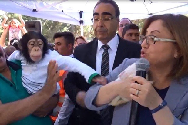 Gaziantep Hayvanat Bahçesi'nin maskotu olan ve bayramlık kıyafetleri giydirilen maymun Can, kıskandığı Gaziantep Büyükşehir Belediye Başkanı Fatma Şahin'e zor anlar yaşattı. Önce Şahin'in kucağında kuzu ve tavşana hamle yapan Can, konuşmalardan sıkılınca ise Fatma Şahin'e saldırdı.