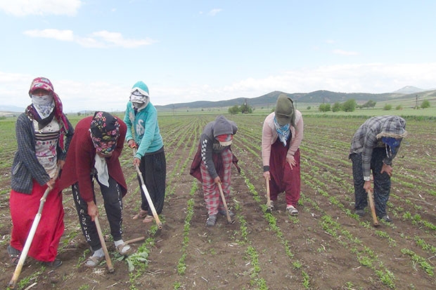 İslahiye ilçesinde geceleri 5 metrelik çadırlar içerisinde 7’şerli gruplar halinde kalan mevsimlik tarım işçileri, gündüzleri ise saatlerce tarla, bağ ve bahçelerde ellerinde kazmalarla çapa yapıyor. İşçiler korona virüs nedeniyle alınan tedbirler altında gün boyu mesai yapıyor. Sosyal mesafe kuralına ellerinden geldiği ölçüde riayet etmeye çalışan işçiler, maske yerine ise tülbent kullanarak ağız ve burunlarını kapatıyor.