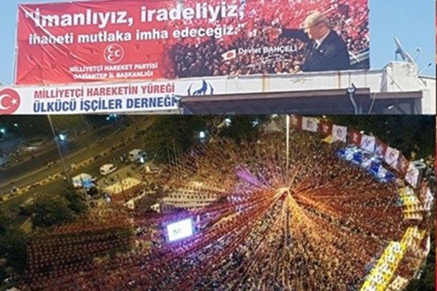 MHP Gaziantep İl Başkanı Yrd. Doç. Dr. Ali Muhittin Taşdoğan, 15 Temmuz darbe girişiminin birinci yıl dönümü nedeniyle sabah saatlerinde de şehir merkezinde Ülkücü İşçiler Derneği’nin bulunduğu binanın çatısına MHP Genel Başkanı Devlet Bahçeli’nin fotoğrafının da yer aldığı dev bir afiş astı. “İmanlıyız, iradeliyiz. İhaneti mutlaka imha edeceğiz” yazılı pankartla hainlere mesaj verildi.