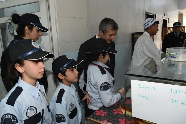 Okullarda bulunan kantin görevlilerinden istedikleri işyeri ruhsatlarını inceleyen minik zabıtalar, satılan ürünlerin son kullanma tarihlerini ve hijyen koşullarını da denetledi.