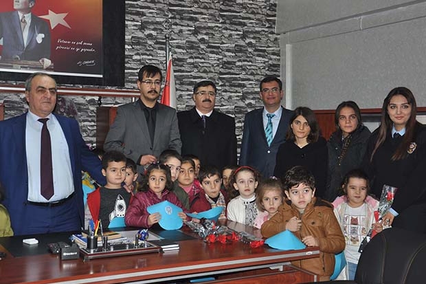 Cumhuriyet İlkokulu anasınıfı öğrencileri, İlçe Milli Eğitim Müdürü Halil İbrahim Demirtaş, Okul Müdürü Ökkeş ve öğretmenleriyle birlikte İlçe Emniyet Müdürlüğü'nü ziyaret etti. Büyükler İlçe Emniyet Müdürü Bedrettin Sarıtaş'a baş sağlığı dileklerini iletirken, minik öğrenciler ise polislere karanfil verdi.