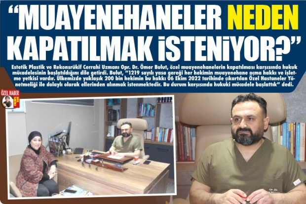 "Türkiye Cumhuriyeti Sağlık Bakanlığı tarafından çıkartılan 06 Ekim 2022 tarihli Özel Hastaneler Yönetmeliği ile muayenehanelerin kapatılmak istenmesinin gerçek nedenlerini ve telafisi olamayan tıbbi ve hukuki sorunları konuşacağız" şeklinde zözlerine başlayan Estetik Plastik ve Rekonsrükif Cerrahi Uzmanı Opr. Dr. Ömer Bulut, Hakimiyet Gazetesi'nden Merve Tanrıöver'in sorularını yantıladı. Bulut, "Anayasal hakkımız olan mesleğimizi serbest icra etmemiz; çalışma alanımız ortadan kaldırılarak çıkartılan bu yönetmelikle engellenmek istenmektedir. Bugün hekimler için uygulanan bu durum, hiçbir meslek grubunun serbest çalışma hakkının kanuni güvencesinin olmadığının göstergesidir. Dolayısıyla tüm meslek gruplarının bir gün serbest çalışma haklarının ellerinden alınma olasılığı aşikardır. Muayenehanesi olan hekimler, herhangi bir Kamu Hastanesi veya Özel Hastanede çalışmayarak, hastasının hiçbir sosyal güvencesini (SSK, Bağ-Kur, Emekli sandığı v.s.) kullanmayarak, tamamen ücretli olarak çalışalar ve yanlarında binlerce çalışanı istihdam ederler. Her hasta tedavisi için alanında en iyi olan hekime gitmek ister. Sorar, soruşturur ve seçtiği doktoruna gidip tedavi olur. Hastaların doktor seçme haklarının ellerinden alınması Anayasaya tamamen aykırı bir durumdur. Muayenehaneye gelen hasta, muayene edildikten sonra tedavisinin yapılacağı özel hastaneye yönlendirilir. Orada hastanın SGK sı kullanılmaksızın tüm tahlilleri ve tedavisi ücretli olarak yapılır. Hasta ameliyat olacak ise, yatışı yapılıp ameliyat edilir. Taburcu olduktan sonra tüm işlemlerine muayenehanede devam edilir" dedi.