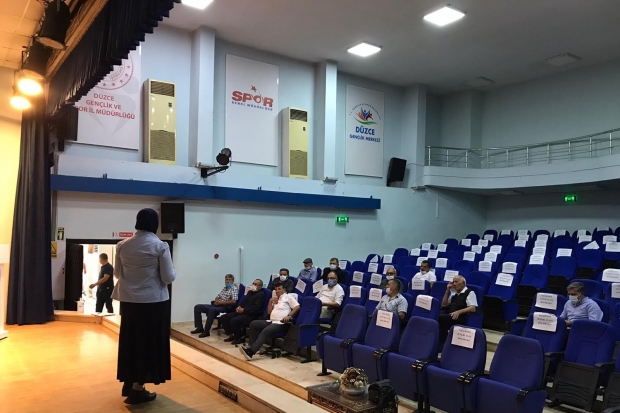 Düzce’de Kadına yönelik şiddetle mücadele farkındalık eğitimleri devam ediyor. Daha önce bir çok kişi ve kuruluşa verilen eğitimler bu sefer Merkez Köy ve Mahalle muhtarlarına da verildi. Düzce Gençlik ve Spor İl Müdürlüğü konferans salonunda gerçekleştirilen eğitimi ŞÖNİM Müdürlüğü personeli Sosyolog Emine Barış verdi. Köy ve Mahalle muhtarlarının katılım sağladığı eğitim programında, muhtarlara Kadına yönelik şiddetle mücadelede farkındalığın nasıl oluşturulması gerektiği üzerine bilgiler verildi.