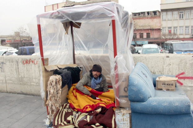 Gaziantep’in merkezinde kış ortasında evi olmayan bir genç, naylon barakada kalıyor.