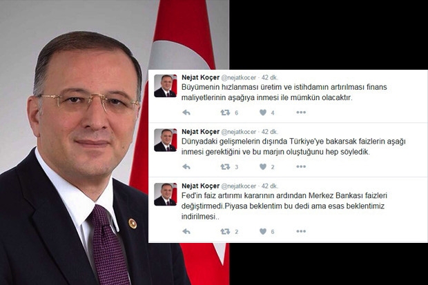 AK Parti Gaziantep Milletvekili Nejat Koçer, sosyal paylaşım sitesi Twitter üzerinden gündeme ilişkin açıklamalarda bulundu. Koçer açıklamasında, “Amerikan Merkez Bankası (FED) faiz artırımı kararının ardından Merkez Bankası faizleri değiştirmedi. Piyasa beklentim bu dedi ama esas beklentimiz indirilmesidir. Dünyadaki gelişmelerin dışında Türkiye'ye bakarsak faizlerin aşağı inmesi gerektiğini ve bu marjın oluştuğunu hep söyledik. Büyümenin hızlanması üretim ve istihdamın artırılması finans maliyetlerinin aşağıya inmesi ile mümkün olacaktır” ifadelerine yer verdi.