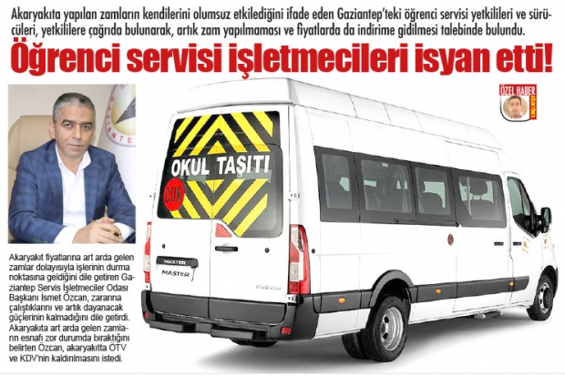 Akaryakıt fiyatlarına art arda gelen zamlar dolayısıyla işlerinin durma noktasına geldiğini dile getiren Gaziantep Servis İşletmeciler Odası Başkanı İsmet Özcan, zararına çalıştıklarını ve artık dayanacak güçlerinin kalmadığını dile getirdi. Akaryakıta art arda gelen zamların esnafı zor durumda bıraktığını belirten Özcan, akaryakıtta ÖTV ve KDV’nin kaldırılmasını istedi.