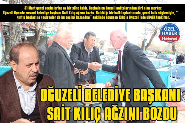 31 Mart yerel seçimlerine az bir süre kaldı. Seçimin en önemli noktalarından biri olan merkez Oğuzeli ilçende mevcut belediye başkanı Sait Kılıç ağzını bozdu. Katıldığı bir halk toplantısında, yerel halk söylemiyle, “….. yırtıp başlarına geçirseler de bu seçimi kazandım” şeklinde konuşan Kılıç’a Oğuzeli’nde büyük tepki var.