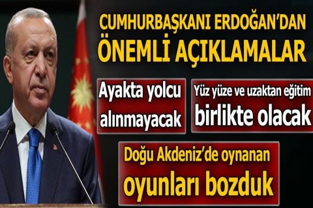 Cumhurbaşkanı Recep Tayyip Erdoğan Kabine Toplantısı sonrası önemli açıklamalarda bulundu. Cumhurbaşkanı Erdoğan okullar ile ilgili olarak, "Ailelerin tercihine göre okul öncesi ve ilkokul 1. sınıf öğrencilerinden başlayarak okullarımızı eğitim öğretime açıyoruz" ifadelerini kullandı. Corona virüs önlemlerine değinen Erdoğan, "Toplu taşımada hiçbir şekilde ayakta yolcu alınmaya müsaade edilmeyecektir." şeklinde konuştu. Türkiye'nin dünyanın birçok ülkesine göre salgında çok iyi durumda olduğunu belirten Erdoğan, "Dün itibarıyla 10 milyon turist rakamını geride bırakmayı başardığımız ortada. Yıl sonuna kadar bu rakamı yüksek seviyelere çıkartacağız." dedi. Cumhurbaşkanı Erdoğan, Doğu Akdeniz'deki gelişmelere dair, " Doğu Akdeniz'de Türkiye'yi kıyılarına hapsetmeye çalışanların oyunlarını bozduk. Ülkemize karşı yapılan her siyasi, diplomatik, askeri yanlış veya saygısızlık bizi yolumuzdan döndürmek bir yana, azmimizi perçinliyor." açıklamasında bulundu.