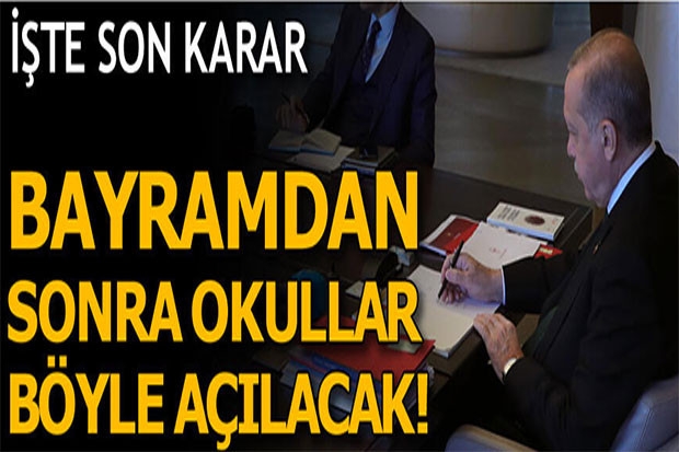 Koronavirüs salgını nedeniyle 16 Mart’tan bu yana kapalı olan okulların kademeli olarak bayram sonrasında 1 Haziran itibarıyla açılması hedefleniyor. Okullar, uzun süre açık kalmayacak ve temmuza sarkmayacak. Okullara ilk etapta sınava girecek sınıflar olan 8. ve 12. sınıf öğrencileri gidecek. Bu öğrenciler herhangi bir sınava girmeyecek, devam zorunluluğu olmayacak. İl pandemi kurulları, illerdeki duruma göre, eğitim sınırlandırması kararı alabilecek. 7 Haziran’da yapılması planlanan LGS, temmuza sarkıtılmamaya çalışılacak. Temmuz sonunda yapılması planlanan YKS’nin ise öne çekilmesi yönünde talepler bulunurken son karar Cumhurbaşkanı Recep Tayyip Erdoğan tarafından verilecek.