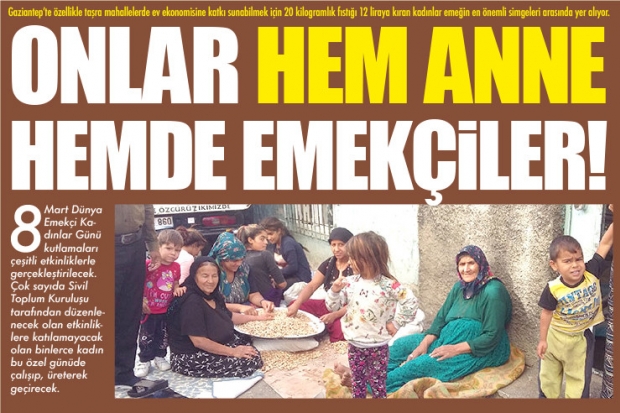 Gaziantep'in taşra semtlerinde yaşayan kadınlar aile ekonomisine katkı sağlamak için fıstık kırma işini yapıyorlar. Üretilen fıstıkların çatlamamış olanlarının kırma işini üstlenen kadınlar, mahallede kurdukları alanlarda fıstık kırıyorlar. Gaziantep'te bulunan bazı fabrikaların Antepfıstığı kırma işini üstlenen kadınlar, gün boyu evlerinin önünde ellerinde çekiçlerle hararetli bir çalışma yapıyorlar. 20 kiloluk bir çuvalı 12 lira karşılığında kıran kadınlar, bu sayede evlerine gelir sağladıklarını da söyledi. Gaziantep'in Barış Mahallesi gibi çok sayıda mahallede evlerde antepfıstığı kırma işi yaptıklarını belirten kadınlar, "Aile bütçesine katkı sağlamak için antepfıstığı kırıyoruz. Bir çuval antepfıstığını 12 lira karşılığında kırarak aile bütçesine katkı sağlıyoruz" şeklinde görüş belirttiler.