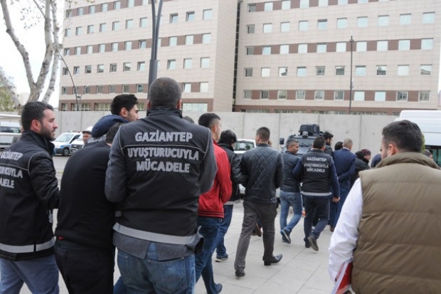 Gaziantep'te polis tarafından 12 adrese düzenlenen operasyonda gözaltına alınan 18 şüphelinin emniyetteki işlemleri tamamlandı. Sorgularının ardından hastanede sağlık kontrolünden geçirilen şüpheliler, güvenlik önlemleri arasında 'Uyuşturucu temin etme ve Uyuşturucu ticareti' suçundan adliyeye sevk edildi.