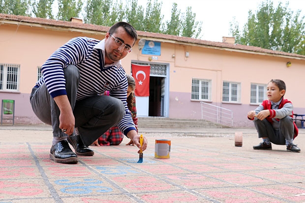 Yeşildere Cumhuriyet İlkokulu sınıf öğretmeni Halil İbrahim Zehir, okulun bahçesindeki beton zemine sayılardan oluşan tablo çizdi. Matematikte kullanılan çarpma, bölme, toplama, çıkarma gibi her işlemi, bu tablo üzerinde gösteren Zehir, öğrencilerine hem oyun oynatıyor hem de ders veriyor. Öğrenciler, beden eğitimi dersindeki gibi oynayarak, matematiksel işlemleri öğreniyor.