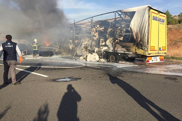 Gaziantep otobanında aynı istikamette seyir eden iki tır çarpıştı. Kazanın ardından pamuk yüklü tır alev aldı. Kazada biri ağır olmak üzere iki tırın sürücüsü de yaralandı.
