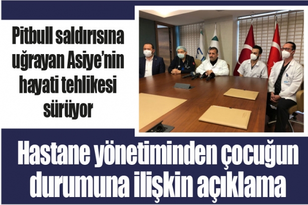 Gaziantep'te bir sitenin bahçesinde pitbull cinsi iki köpeğin saldırısı sonucu ağır yaralanan 4 yaşındaki Asiye Ateş’in tedavisi sürüyor. Dün ilk olarak Şahinbey Eğitim ve Araştırma Hastanesi’nde tedavi altına alınan Ateş, durumunun ağırlaşması üzerine kentteki özel bir hastaneye sevk edildi. Hastane yönetimi sosyal medyada gündem olan kız çocuğunun sağlık durumuna ilişkin basın toplantısı düzenledi. Hastane Başhekimi Dr. Beyhan Tahmazoğlu, Asiye’nin hayati tehlikesinin devam ettiğini belirterek, ilk geldiği ana göre şuan ki durumunun daha iyi olduğunu açıkladı.