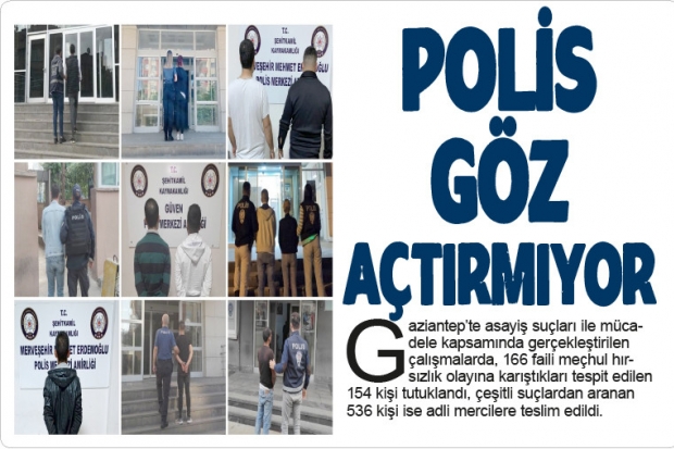 Gaziantep Emniyet Müdürlüğünden yapılan yazılı açıklamada, ‘’12.10.2022-18.10.2022 tarihleri arasında Asayiş Suçları ile Mücadele Kapsamında yapılan çalışmalarda; 31 adet ruhsatsız tabanca, 23 adet kurusıkı tabanca, 23 adet ruhsatsız tüfek, 489 adet fişek ele geçirilmiş, 166 faili meçhul hırsızlık olayı aydınlatılmıştır. Belirtilen olaylara karıştıkları tespit edilerek yakalanan 942 şüpheliden, 154’ü sevk edildikleri Adli Mercilerce tutuklanmış, 2’si hakkında adli kontrol kararı verilmiş, 786 şüpheli ise serbest bırakılmıştır. Ayrıca çeşitli suçlardan aranan 536 şüpheli yakalanarak Adli Mercilere teslim edilmiştir’’ denildi.