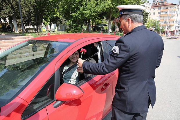 Trafik Haftası dolayısıyla Gaziantep'te trafik polisleri durdurdukları araçlardaki sürücülere karanfil dağıttı.
