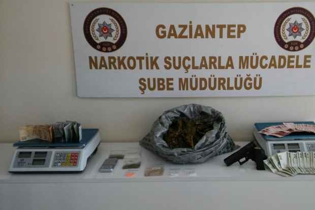 Gaziantep Emniyet Müdürlüğü Narkotik Suçlarla Mücadele Şube Müdürlüğü görevlilerince Gaziantep’te yapılan operasyonlar sonucu, 9 kilo 500 gram esrar, 121 kök kenevir bitkisi, 26 gram metamfetamin (ateş-buz), 18 gram eroin, 18 gram sentetik bonzai, 7 adet ecstasy hap ile 4 adet hassas terazi, 2 adet tabanca, 1 adet pompalı tüfek ve 7 bin 430 TL para ele geçirildi.