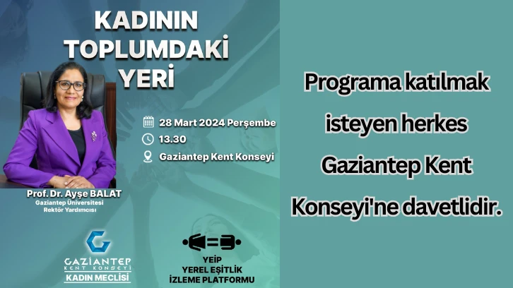 Prof. Dr. Balat, kadının toplumdaki yerini ve etkisini değerlendirmek amacıyla 28 Mart 2024 Perşembe günü Gaziantep Kent Konseyi'nde bir söyleşi gerçekleştirecek.