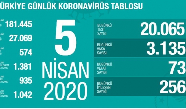 Sağlık Bakanlığından yapılan açıklamada, korona virüs nedeniyle son 24 saatte 73 kişinin hayatını kaybettiği toplam vefat sayısının 574 olduğu açıklandı. Açıklamada, bugünkü test sayısının 20 bin 065, vaka sayısı ise 3 bin 135 olduğu belirtildi. Toplam test sayısının 181 bin 445, toplam vaka sayısının 27 bin 069, yoğun bakım hasta sayısının bin 381, entübe hasta sayısının 935, iyileşen hasta sayısının 1 bin 42 olduğu kaydedildi.