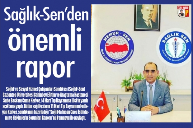 Sağlık ve Sosyal Hizmet Çalışanları Sendikası (Sağlık-Sen) Gaziantep Üniversitesi Şahinbey Eğitim ve Araştırma Hastanesi Şube Başkanı Cuma Kerkez, 14 Mart Tıp Bayramına ilişkin yazılı açıklama yaptı. Bütün sağlıkçıların 14 Mart Tıp Bayramını kutlayan Kerkez, sendikanın hazırladığı “Sağlıkta İnsan Gücü İstihdamı ve Hekimlerin Sorunları Raporu”nu kamuoyu ile paylaştı.