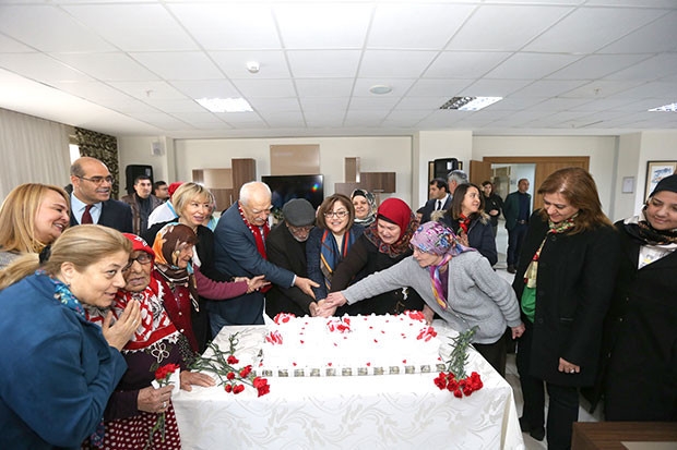 Günün anısına pasta kesen Başkan Fatma Şahin, yaşlılara kırmızı gül verdi.