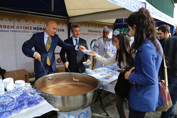 Muharrem ayında hem yas, hem hüzün, hem de bolluk bereket olduğunu ifade eden Şahinbey Belediye Başkanı Mehmet Tahmazoğlu, “Cenabı hakkın “Muharrem ayı benim ayımdır” diye önemle belirttiği bu ay içerisinde tutulan oruçlar, verilen sadakalar ve yapılan hayırların çok bereketli ve sevaplı olduğunu biliyoruz.Muharrem ayı mübarek bir ay. Aşure dediğimiz yiyecek, bu mübarek ayın ruhuyla da çok örtüşmektedir. Aşurenin içine onlarca değişik malzeme katıyor ve toplamında çok güzel bir tat elde ediyoruz.Bu ayın içerisinde Muharrem ayının 10. günü tüm Müslüman aleminde olduğu gibi Gaziantep halkında da aşure yapmak gelenek haline gelmiştir. Biz Şahinbey Belediyesi olarak bu güzel geleneği göreve geldiğimiz günden itibaren devam ettiriyoruz. Aşure ikramı vesilesiyle hem birlik beraberliğimizi pekiştiriyor hem de bizim güzel bir geleneğimizi daim etmek için katkı sağlamış oluyoruz. Bugün de Hasan Kalyoncu Üniversitemizde eğitim gören öğrencilerimize, hocalarımıza ve çalışanlarımıza aşure ikramı yapıyoruz. Bizleri çok güzel ağırladıkları için Sayın Rektörümüze teşekkür ediyor, Muharrem Ayının hayırlara vesile olmasını diliyorum” dedi.