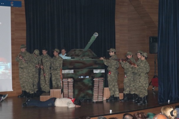 Gaziantep'te bir özel okulun öğrencilerinin 15 Temmuz ile ilgili sergiledikleri tiyatro gösterisi gerçeği aratmadı. Seyircilerin üzerinden uçarak salona giren helikopter ile tankların kullanıldığı oyunda, Bogaz Köprüsü ve TRT'nin ele geçirilmesi ile Ömer Halisdemir'in şehit edilmesi birebir canlandırıldı.