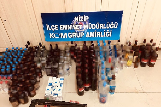 GAZİANTEP'in Nizip ilçesinde 3 işyerine düzenlenen operasyonda 250 şişe sahte içki, ruhsatsız tüfek ve 500 sahte bandrol ele geçirildi, 3 kişi gözaltına alındı.