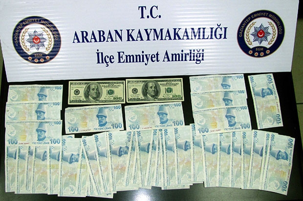 Araban ilçesinde bir esnaf, 155’i arayarak iş yerine 63 L 4900 plakalı otomobille sahte para ile alışveriş yapmak isteyen bir şahsın geldiğini ihbar etti. Geniş çaplı çalışma başlatan ekipler, ilçe merkezindeki Gaziantep Caddesi'nde ihbar edilen aracı durdurarak, sürücü R.T.’nin cüzdanında ve araç içerisindeki D.P.’nin çantasında 39 adet sahte 100 TL’lik banknot iki adette sahte 100 ABD Doları ele geçirdi.