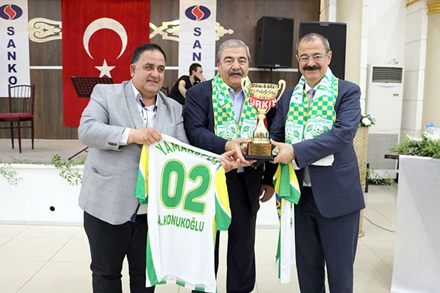SANKO Holding Yönetim Kurulu Üyesi Yiğitcan Konukoğlu, Sanko Tekstil İşletmeleri Genel Müdürü Ökkeş Cansız, Sanko Tekstil Adıyaman İşletmeleri Genel Müdür Yardımcıları Hüseyin Özhan ve Hüseyin Demir, Sanko Özel Güvenlik Genel Müdürü Ferhat Arslan, Sanko Holding Personel Direktörü Gündüz Taşkın, Çimko Çimento Teknik Direktörü Fatih Aktaş, Satış Direktörü Mehmet Ülger ve Çimko Adıyaman Fabrika Müdürü Cemal Gülsoy’un da katıldığı yemek sırasında, Yamanspor Kulübü Başkanı Abdurrahman Vural SANKO’nun kulübe desteklerine teşekkür ederek, kazandıkları “Türkiye 18 Yaş Genç Erkekler Hentbol 2018” kupasını ve Yamanspor formasını SANKO Holding Onursal Başkanı Abdulkadir Konukoğlu ve Yönetim Kurulu Başkan Vekili Adil Sani Konukoğlu’na sundu.